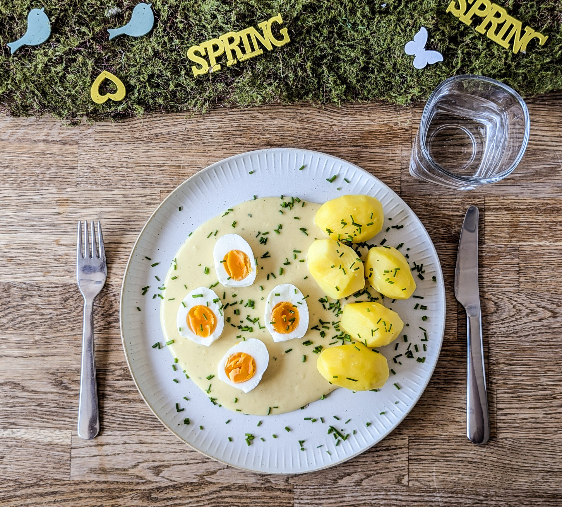 Ganz klassisch werden Senfeier mit Kartoffeln serviert. Zu dem Ein-Euro Rezept nach Oma passen aber auch andere Zutaten ganz gut. Kartoffelpüree oder sogar Reis passen hervorragend dazu. Wenn Du etwas Frische möchtest, ergänze das Gericht mit einem einfachen Gurkensalat. Ich streue gerne noch ein paar frische Kräuter darüber. Heute gab es frischen Schnittlauch aus meinem Kräuterhochbeet. Es passen aber auch Petersilie, oder Kresse.